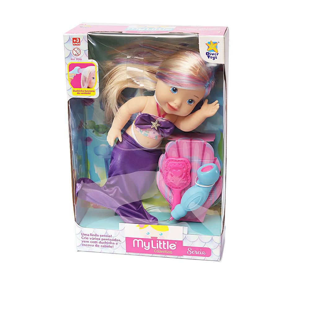 A Boneca My Little Collection Sereia da Divertoys é uma belezinha! Acompanha uma linda escovinha e duchinha que funciona de verdade para lavar seus cabelos, as meninas vão adorar.